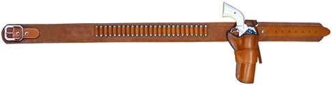 "They wanted gold. They gave them lead instead!"... This is the sytle of gunbelt and holster worn by John Wayne ("The Duke") in the movie Big Jake. An aging Texas cattle man who has outlived his time swings into action when outlaws kidnap his grandson and wound his son. He returns to his estranged family to help them in the search for Little Jake. This rig constructed of premium saddle leather rough out 2.75" wide, folded and saddle stitched with 24-30 cartridge loops. It also features a nickel plated solid brass buckle. The holster is leather lined, with golden brown oil finish. We can fit most single and double action revolvers except black powder. We can fit the holster to several .22 cal revolvers however, we are not able to stitch the bullet loops for the .22cal.